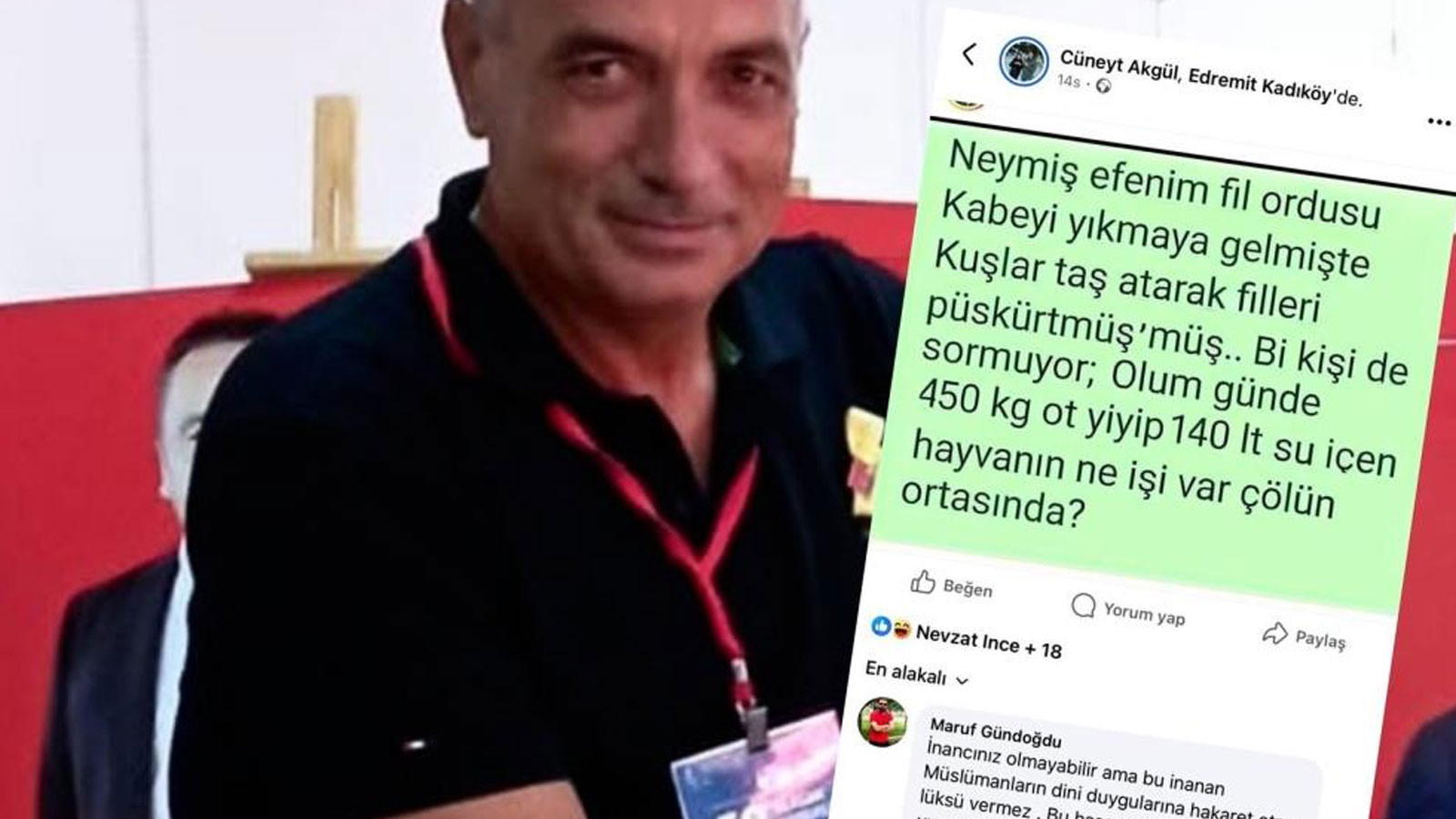 CHP Edremit İlçe Başkanlığı, Kadıköy Mahalle Sorumlusu Cüneyt Akgül‘ün sosyal medya hesabında yaptığı, Fil Suresi‘ne atıfta bulunan alaycı paylaşımın ardından Akgül’ü görevden uzaklaştırdı. Akgül, sosyal medya platformunda yaptığı paylaşımda, “Fil ordusu Kabe’yi yıkmaya gelmiş de kuşlar taş atarak filleri püskürtmüşmüş. Bir kişi de sormuyor; günde 450 kg ot yiyip 140 litre su içen hayvanın ne işi var çölün ortasında?” ifadelerini kullanmıştı. Bu paylaşım, sosyal medyada büyük bir tepki topladı.